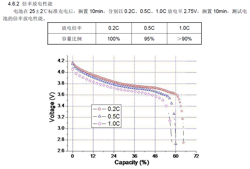 電池容量是指在環境溫度 20±5℃的條件下,以 0.5CmA 恒流充電,當電池端電壓達到充電限制電壓 4.20V 后,放置不超過 1 小時,再以 0.5CmA 電流恒流放電到 2.75V 所測的容量。