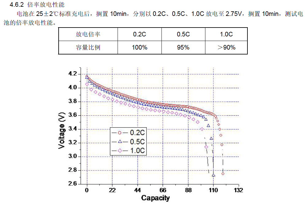 電池容量是指在環(huán)境溫度 20±5℃的條件下,以 0.5CmA 恒流充電,當(dāng)電池端電壓達(dá)到充電限制電壓 4.20V 后,放置不超過(guò) 1 小時(shí),再以 0.5CmA 電流恒流放電到 2.75V 所測(cè)的容量。